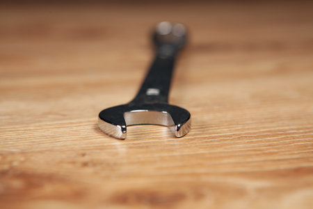 Close up shot of a metal wrench on a wooden background.
