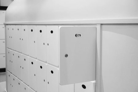 Slightly open locker door. Storage for items after changing into gym clothes in busy gym. Numbered doors for temporary storage. Modern locker closing mechanism