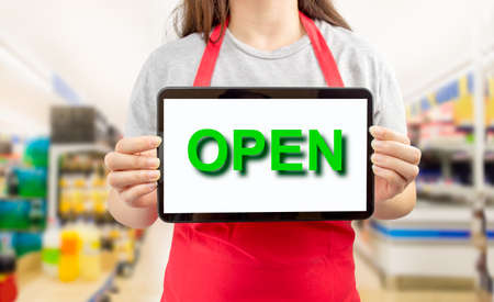 Portrait of a beautiful young woman in a supermarket shop holding up an OPEN signal