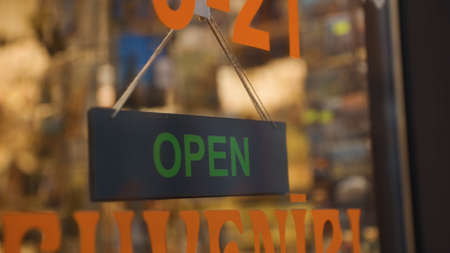 Close up of the sign board Open shop or cafe of the window at the door