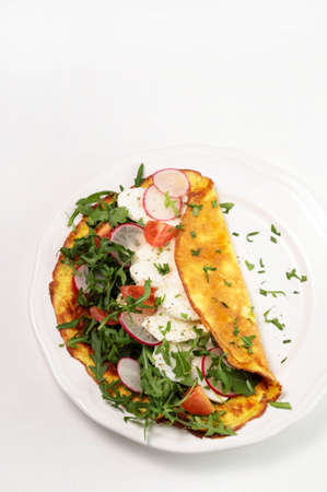 Spring healthy diet food concept. Scrambled eggs, Stuffed omelet with fresh vegetables, tomatoes, rucolla, lettuce, on a white background copy space