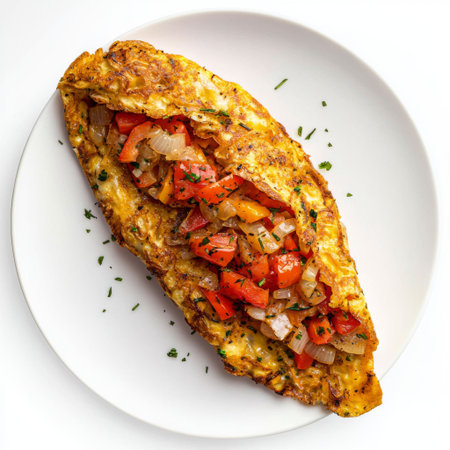 A beautifully presented vegetable omelet featuring fresh ingredients, ideal for breakfast or brunch. Perfect for cooking enthusiasts and food photographers alike.