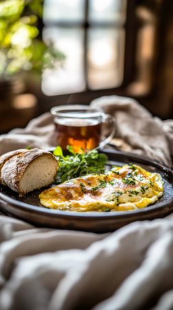A sunny kitchen features a warm breakfast spread with fresh omelette topped with herbs, crusty bread, and a cup of tea, perfect for a relaxing morning at home