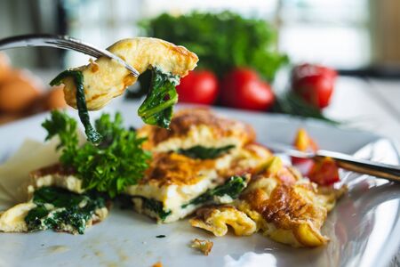 Traditional omelet with vegetables, spinach, tomatoes and herbs on a wooden table in a restaurant. Classic european breakfast. Fried eggs with milk and cheese. Soft focus.