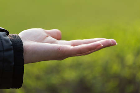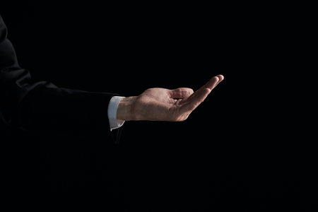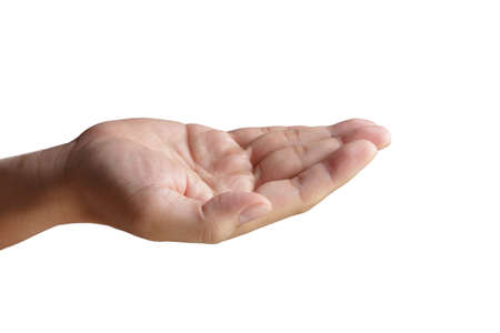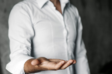 Businessman with open palm offering something. Close-up of young businessman's hand in concept of holding or giving.