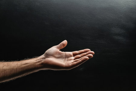 A close-up shot of a man's open hand with the palm facing upwards, set against a soft, vignetted background. The gesture can symbolize asking, receiving, giving, charity, or openness. The lighting is focused on the palm, highlighting the lines and skin texture.