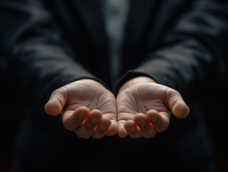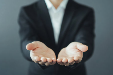 The image depicts a person dressed in a formal suit with hands outstretched and palms open conveying a welcoming or inviting gesture. This posture suggests openness and readiness to engage making it ideal for contexts related to communication networking or customer service