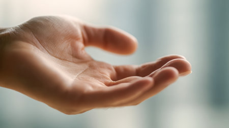 A delicate hand gently raised, palm open and facing upward, conveying empathy and openness amid a softly blurred, unobtrusive backdrop.