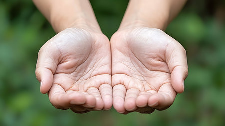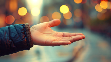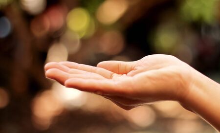A close-up of open hands presented forward, as if offering or requesting something, with a blurred background adding focus.