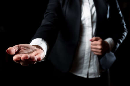 Businesswoman Holding Important Message In One Hand. Woman In Suit Showing New Crutial Idea In A Palm. Executive Presenting Updated Critical Information.