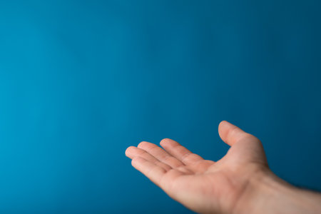 Human hand extending, palm up, symbolizing giving, receiving, support, care, and generosity against a clear blue and serene background, conveying concepts of assistance and humanitarian aid