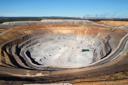 A vast open-pit mine reveals the earth's layers, a testament to industrial excavation.