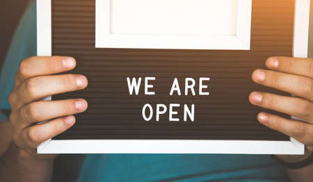 we are open. Opening of enterprises after quarantine. man holding a sign.