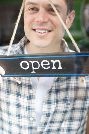 Close Up Of Smiling Male Small Business Owner Turning Around Open Sign On Shop Or Store Window Or Door