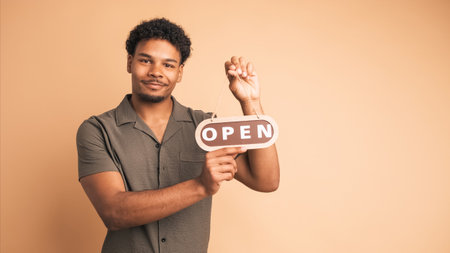 Smiling man with open sign inviting in beige studio