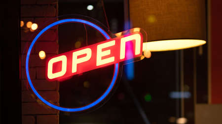 Neon orange sign with the word Open hanging on a glass door. High quality photo