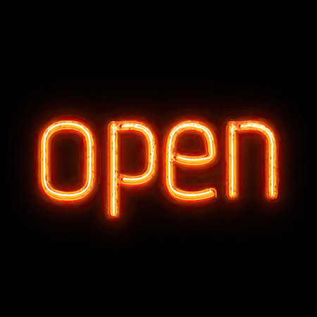 This image showcases a vibrant neon sign spelling open. The sign glows with a warm orange hue against a deep black background. The composition is simple, with the illuminated word taking center stage. Ideal for advertising, promotional materials, or editorial content related to business and commerce.