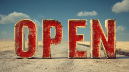 A weathered red OPEN sign stands prominently in a vast desert landscape, surrounded by a clear blue sky and scattered clouds, inviting passersby.