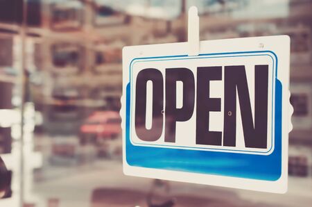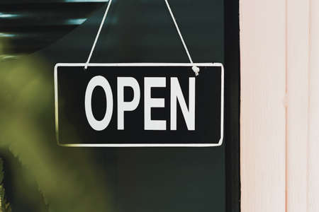 A business sign that says ‘Open’ on cafe or restaurant hang on door at entrance. Vintage color tone style.