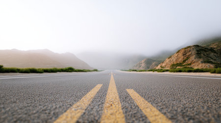 This captivating image features a deserted road extending into the misty mountains, surrounded by lush greenery. Ideal for themes of travel and exploration.