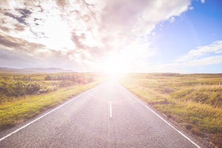 Asphalt texture, way background. Landscape scene and sunrise above road.
