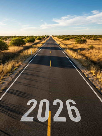 Happy New Year 2026 The number 2026 is located on the highway through the desert in the morning.
