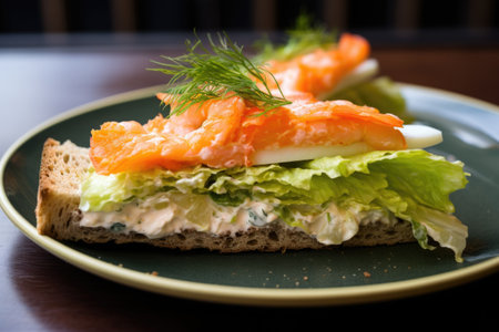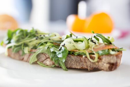 healthy fresh smoked salmon sandwich with egg and sour cream