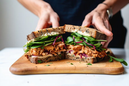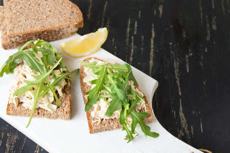 Chicken salad and arugula sandwich on wooden board