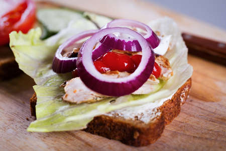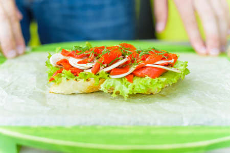Homemade vegan and vegetarian sandwiches with tomato, lattuce radish, cucumber and spring onions. Healthy breakfast.