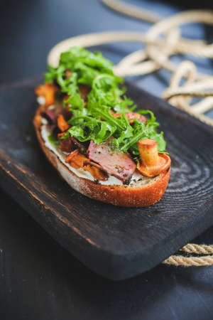 Breakfast sandwich with homemade paste, vegetables and fresh greenson wooden cutting board over rustic background, shallow depth of field, close-up. Delicious morning appetizer. Gourmet bruschetta. Healthy eating concept.