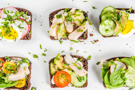 Variety sandwiches with cream cheese, egg, asparagus, avocado, cucumber, shrimp, salami, micro greens on a light background, top view