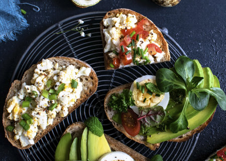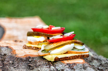 Delicious, healthy sandwiches with vegetables, egg, cheese and meat.