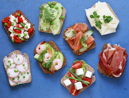 top view of tasty smorrebrod sandwiches on blue wooden surface