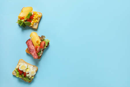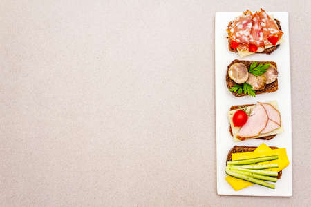 Assorted sandwiches with different fillings, meats, cheese and vegetables. Fresh snack on stone background, top view, copy space