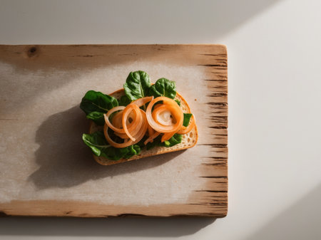 Beef sandwich with onion and Chinese cabbage on wooden cutting board