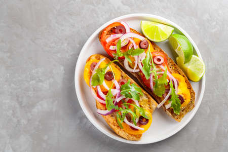 Healthy vegetarian toasts and lime on white plate. Bruschetta with tomatoes, greens and olives. Healthy open sandwiches on concrete. top view. copy space