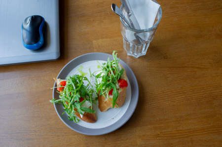 Healthy sandwich on office table. Laptop on the table and a sandwich. Computer and food
