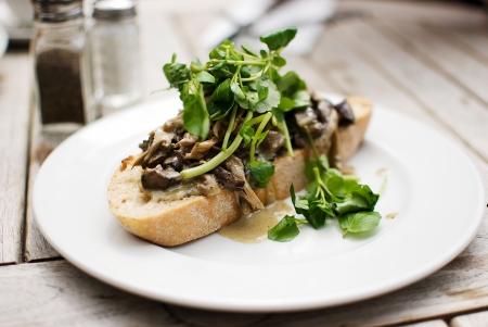 delicious mushrooms and green herb over slice of bread