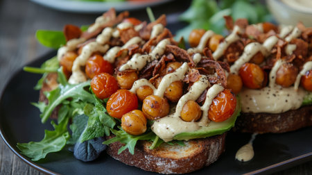 A vibrant open-faced sandwich showcases a base of dark bread topped with creamy spread, colorful peppers, tomatoes, and fresh greens. Enjoyed at a cozy midday gathering in an inviting atmosphere.