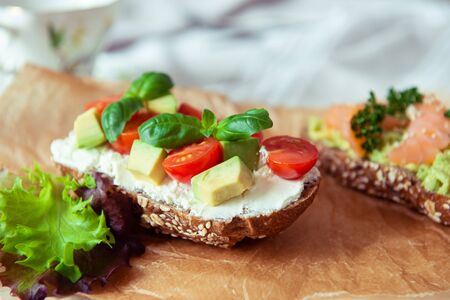 toasts with salmon, cottage cheese, avocado, microgreens on white background, open fish sandwiches, closeup