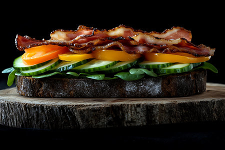 sandwich with bacon and tomato on dark background.