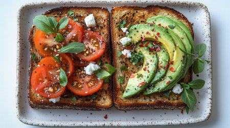 Avocado toast with cherry tomatoes and feta cheese on plate. Healthy eating concept.