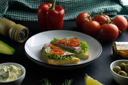 sandwich for breakfast with vegetables - slice of whole grain dark bread, red pepper, cream cheese with green dill on white table Top view Flat lay Vegan healthy food.