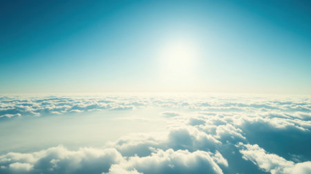 Luminous showing a bright, intense sun shines from the upper center through a hazy sky filled with soft, diffused clouds and a layer of fluffy clouds below...