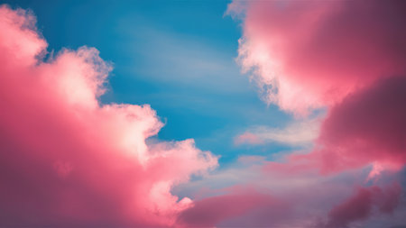 A breathtaking view of a vibrant pink and blue sky filled with soft fluffy clouds during sunset or sunrise.