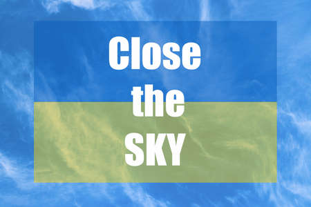 Ukrainian flag against the blue sky and the inscription CLOSE THE SKY. The concept of protecting Ukraine from Russian aggression. War in Ukraine