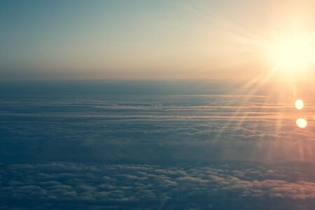 Beautiful sunrise cloudy sky from aerial view. Airplane view above clouds - Background