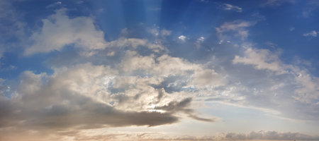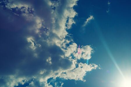 Bright blue sky background, lighted clouds. Nature composition. Panoramic sunset scenery, sparkle sun and clouded sky.