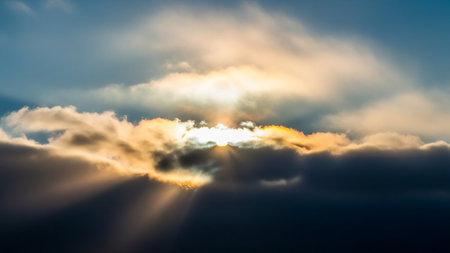 A dramatic sunset sky with golden sunbeams breaking through dark, voluminous clouds, casting light across the blue...