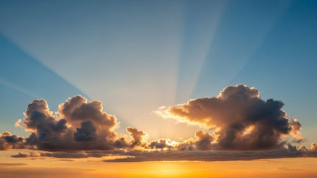 With showing dramatic sunset sky with radiant sunbeams bursting through fluffy clouds over a warm horizon.